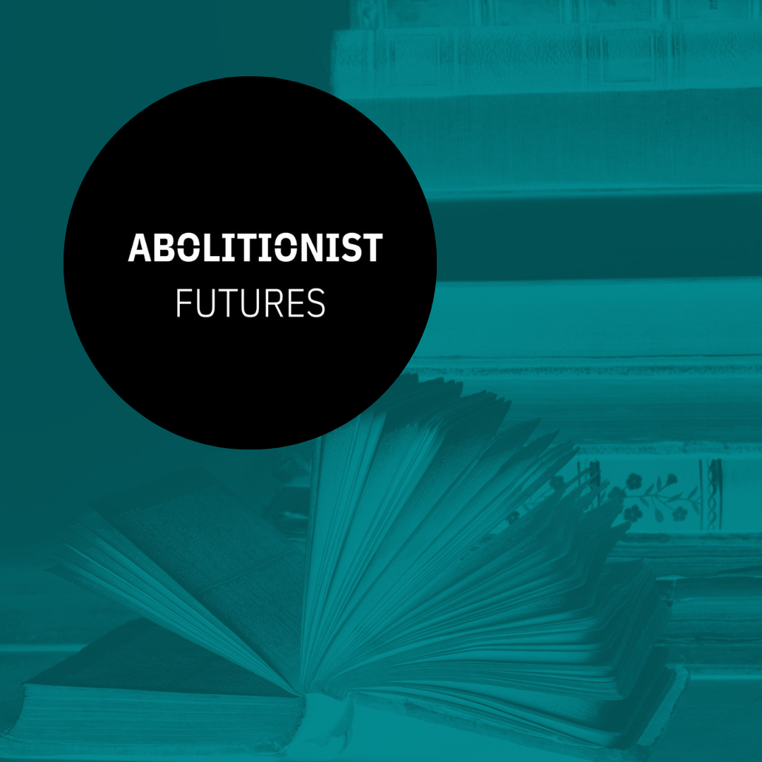 Abolitionist Futures logo, over photo of a book, with teal colour over the photo