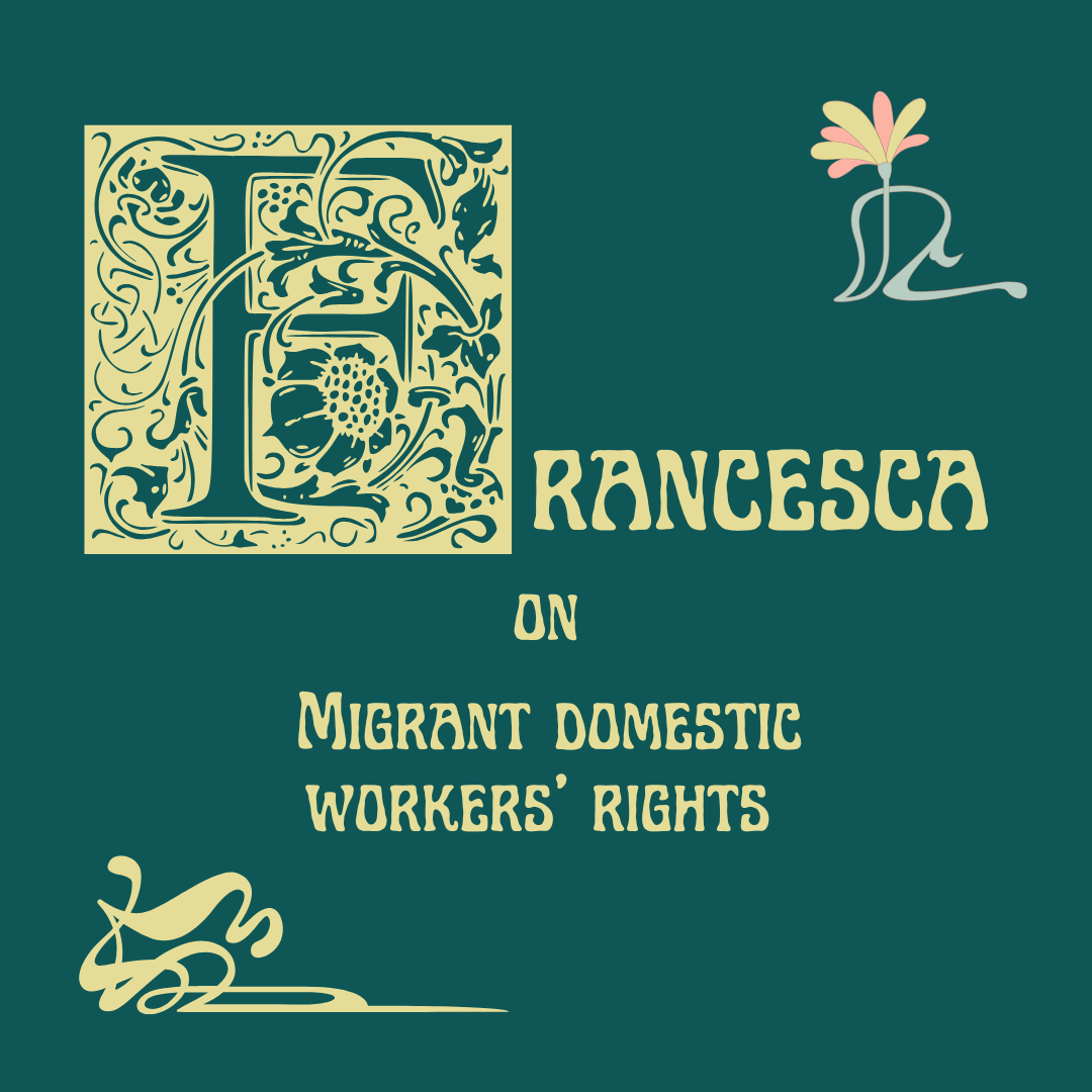 Green square with stylised light yellow writing & graphics that say Francesca on migrant domestic workers’ rights