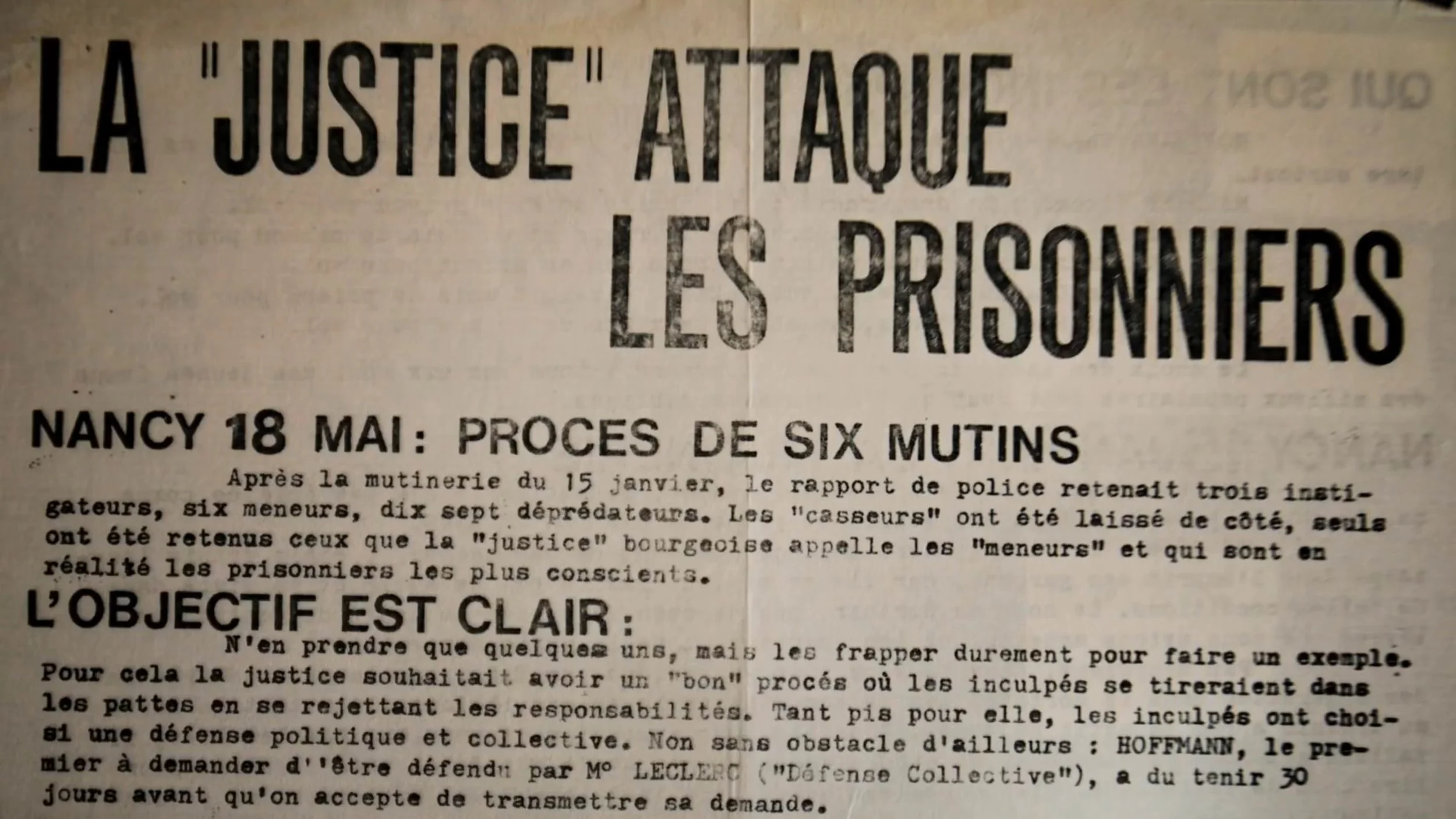 From January to April 1972, these different actors carried out competing investigations into the events in order, on the one hand, to prepare for the future trial of the mutineers (six were prosecuted), and on the other hand, to put the prison on trial, through the voices of the prisoners. This was the first major trial of the prison system since the Liberation in 1945.