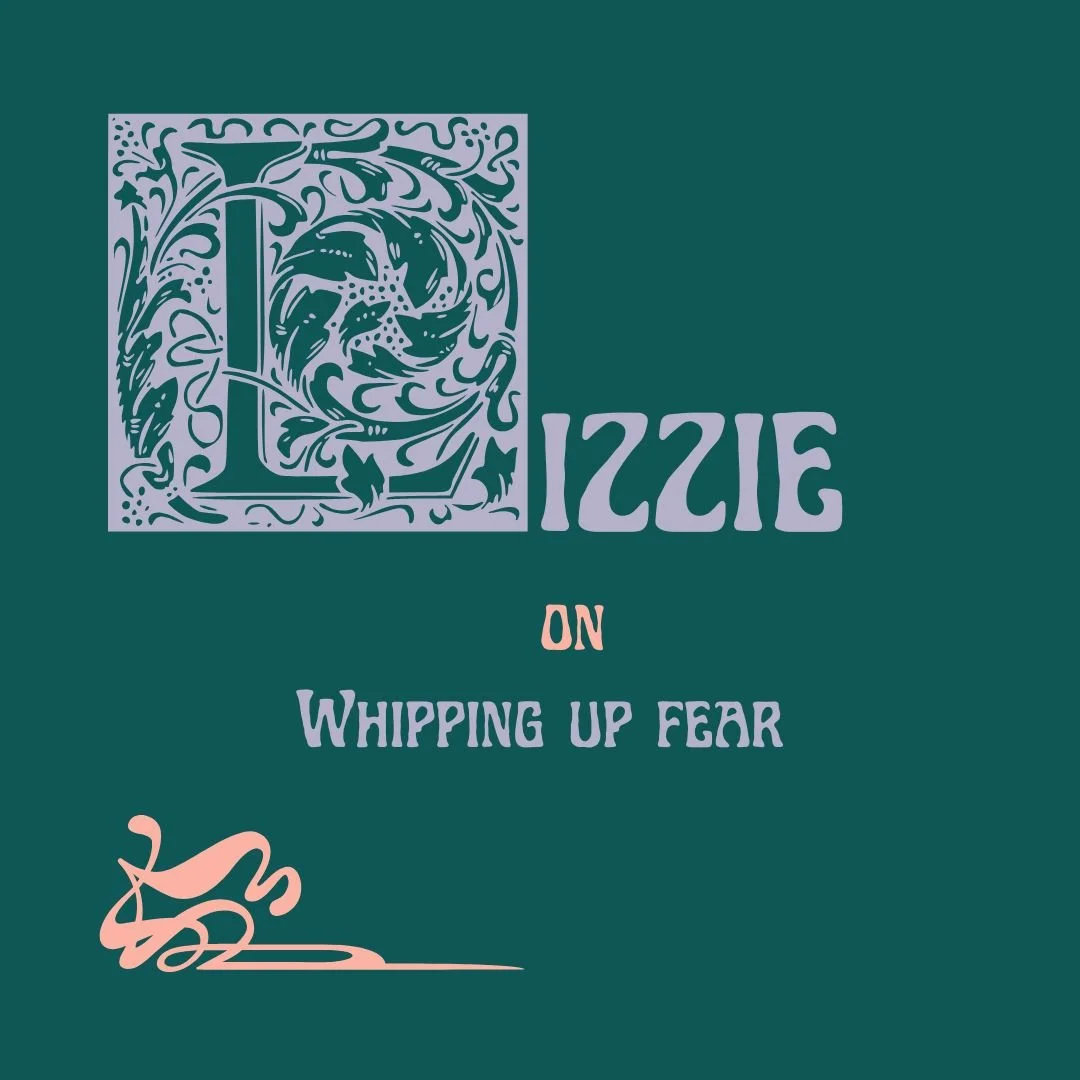 Green square with stylised grey liliac writing & graphics that say Lizzie on Whipping up fear.